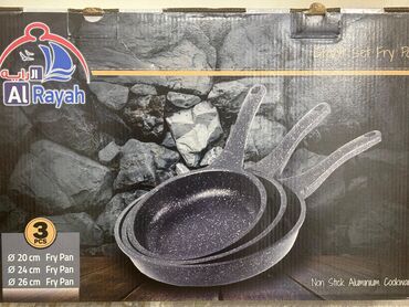 Üç ədəd qızartma tava dəsti - Ölçülər: təxmini 20 sm, 24 sm və 28 sm diametr - Material: alüminium korpus, yapışmayan daxili örtük - Orta tavada əlavə olaraq qranit tipli nöqtəli (stone/granit eff...