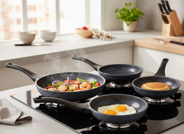 Tac markasının Granit tava desti 3 ölçü - Ölçülər: 26 sm, 28 sm, 30 sm - Korpus qalınlığı: 3 mm - Hündürlük: 5 sm (26 sm model üçün) - Qulp: 18 sm, istiliyədavamlı bakalit - Gücləndirilmiş, granit...