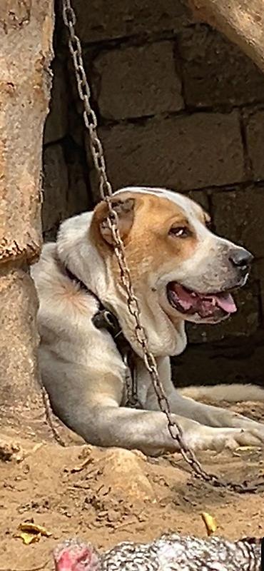 İş heyvanları üçün gözətçi it – iri cüssəli, açıq krem rəngli, qısa tüklü erkək. Güclü skelet quruluşu, möhkəm sinə və uzun ayaqlar; qalın quyruğu qamçı kimi yuxarıda daşıyır. Başı enli, qulaqlar y...