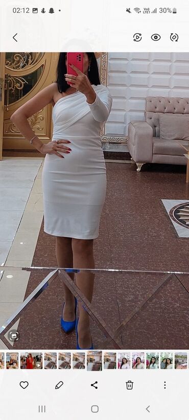 Ozumlari aciq kokteyl/libas – açıq mavi rəng - Model: bədənə oturan, midi uzunluq (dizdən aşağı). - Dizayn: Asimmetrik kəsim, yalnız sağ çiyində dekor. Çiynində həcmli tük/peykkürklü applikasiya il...
