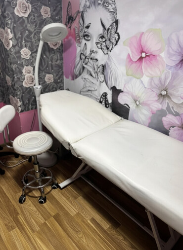 - Kosmetoloji çarpayı və stul: tənzimlənə bilən metal karkaslı masaj/kosmetoloji çarpayı, yumşaq üzlüklə. Rulon təkərli, hündürlüyü tənzimlənən kosmetoloq stulu.