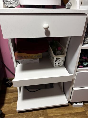 - Saxlama mebeli: üstü çekmecəli, iki açıq rəfli ağ servis masası/çiçək rəfi tipli şkaf; cihaz və aksesuarların yerləşdirilməsi üçün uyğundur.