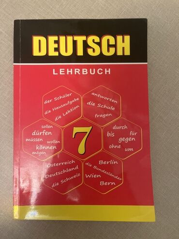 - “Deutsch Lehrbuch 7” – 7-ci sinif üçün alman dili dərsliyi (qırmızı üzlük, mövzu başlıqları: modal felilər — dürfen, müssen, wollen, können, mögen; ölkələr və şəhərlər — Deutschland, Österreich, die Schweiz, Berlin, Wien, Bern və s.; yönlük və qeyri-müəyyənlik qoşmaları — durch, bis, gegen, ohne, um və s.).