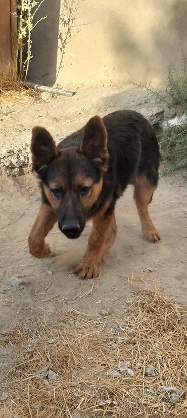 Alman çoban iti balası - Cins: Alman çoban iti (qara-qəhvəyi rəng, dik qulaqlar, güclü skelet) - Təxmini yaş: bala dövrü (fotolarda görünür) - Xarakter: ağıllı, diqqətli, insanlarla mehriban, oyan...