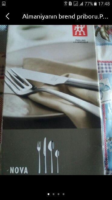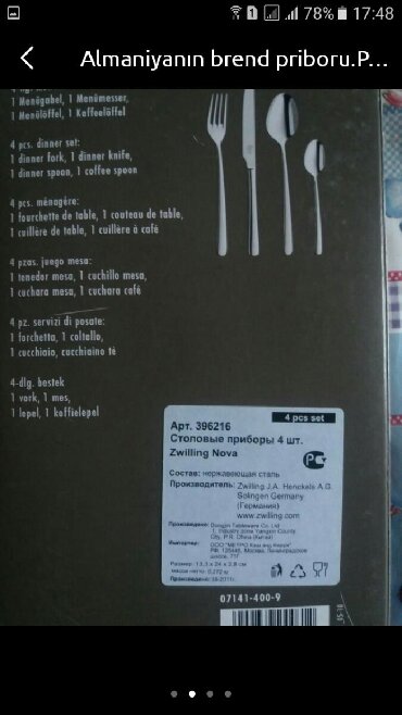 AlmaniyaAlmaniyadan alınıb.Brend mağazadan.Təmiz polad.1qutuda 1çay qaşığı q xörək qaşığı 1 çəngəl 1 bıcaq var.Arxa tərəfində zavodun möhürü var.30 avroya alınıb