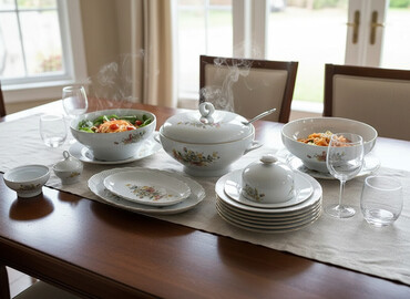 Yeni 12 nəfərlik Nahar və Çay Servizi – 127 ədəd! Zərif dördkünc forma, üzərində incə gül naxışı (çəhrayı və yaşıl tonlarda), klassik ağ rəng ilə süfrənizə gözəllik qatacaq. Çin istehsalı (Aurati...