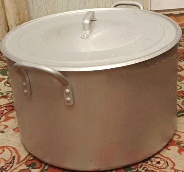 Böyük həcmli alüminium qazan -böyük ve balaca - Material: qalın divarlı alüminium - Forma: dərin, silindrik korpus, perçinli iki yan qulplu - Ölçü təxmini: diametr ~35–40 sm, hündürlük ~30–35 sm (...
