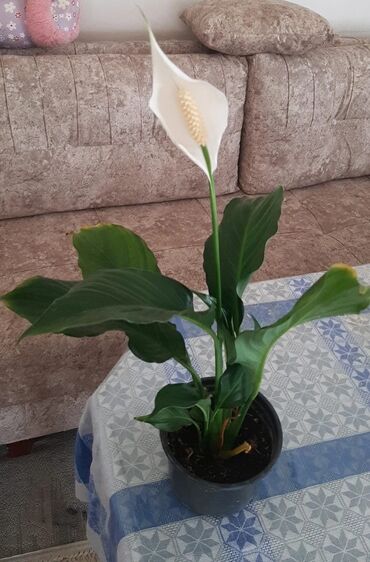 2) Sülh zanbağı (Spathiphyllum) – tünd yaşıl iri yarpaqlar və ağ spatlı çiçək. Otaq bitkisidir, dolayı işıqda yaxşı inkişaf edir. Havanı təmizləmə xüsusiyyəti ilə tanınır. Torpağı nəm saxlayın, soyuq küləkdən qoruyun.