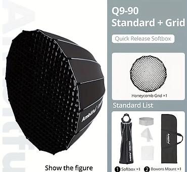 - Forma: dərin paraflaş/okta softboks (16 tərəfli), 90 sm diametr
