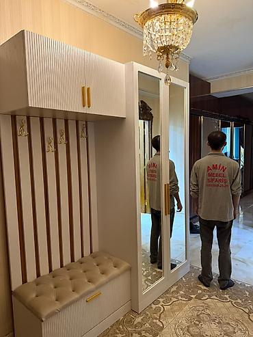 DƏHLİZ MEBELİ Müasir dizaynlı, funksional dəhliz dəsti. - Modul quruluş: yüksək dolablar, asılqanlı panel və oturacaq zonası - Oturacaq hissəsi: düyməli, yumşaq süngərli döşəmə, alt hissədə çekmec...