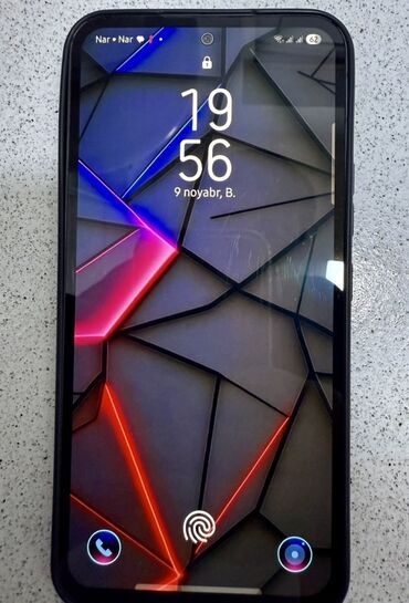 - Ön panel: Tam ekranlı displey, yuxarı mərkəzdə punch‑hole ön kamera. Ekranda barmaq izi ikonası – displeydaxili barmaq izi oxuyucusu dəstəyi.