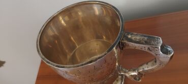 Metal qab – dekorativ fincan/kupa - Material: güman ki, mis və ya mis-ərinti, üzəri gümüşü rəngli (nikellənmiş) örtüklə - Forma: qabarıq gövdəli, yuxarıya doğru genişlənən boğazlı - Tutacaq: bədii...
