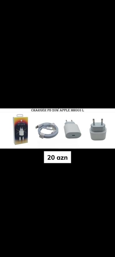 - “CHARGER PD 20W APPLE MH003 L” başlıq və USB‑C – Lightning kabeli ilə komplekt variantı