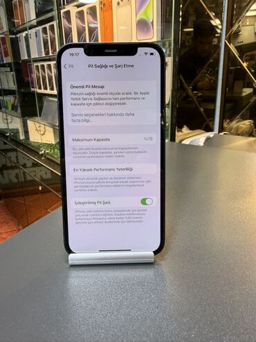 Qutuda və vitrində göstərildiyi kimi iPhone modelləri mövcuddur; şəkillərdə cihaz haqqında bölmələr və batareya məlumatları təqdim edilib.