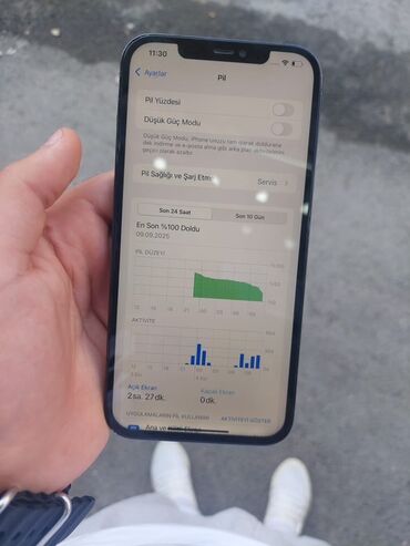 Telefon detalları şəkillərdə: ön panel, arxa panel və kamera modulu, həmçinin “Pil Sağlığı və Şarj Etme” bölməsi göstərilib. iOS ekranda 4 Ekim Cumartesi 11:30 vaxtı görünür.