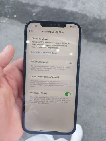 - Ekranda görünən məlumat: Batareya sağlamlığı menyusunda Maksimum Kapasite 70% olaraq göstərilir; İyileştirilmiş Pil Şarjı aktivdir