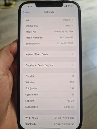 Ünvandan götürməApple iPhone 12 Pro Max modeli 128 GB daxili yaddaşa malikdir. Cihaz iOS 16.6.2 əməliyyat sistemi ilə işləyir. Batareyanın maksimum tutumu 74%-dir. Qrafit rəngdədir.