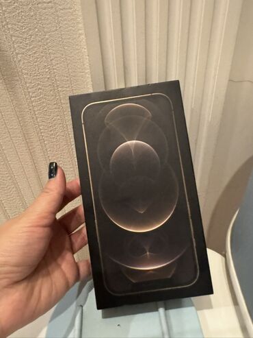 Şəkillərdə telefonun ön/arxa görünüşü və orijinal qutusu göstərilib. Model iPhone 12 Pro Gold olub, üçlü kamera və LiDAR ilə peşəkar foto/video imkanları, güclü A14 Bionic performansı və OLED ekran keyfiyyəti təqdim edir.