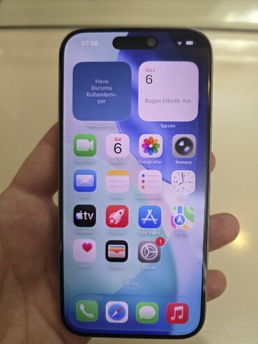 Məhsul: Apple iPhone (15Pro seriyası, gümüşü rəng) - Ekran: Dynamic Island kəsikli tam ekran, Face ID dəstəyi - Korpus: Mat gümüşü arxa səth, cilalı kənarlar - Kamera sistemi: Arxada üçlü kamera mo...