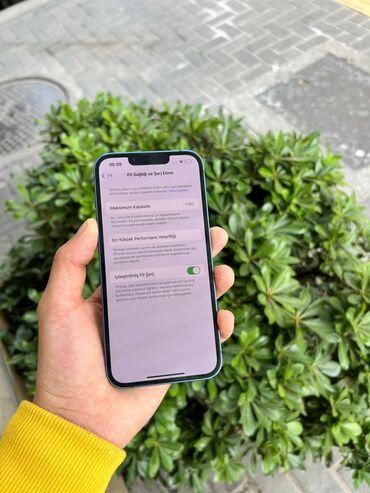 Şəkillərdə cihazın həm ön, həm arxa görünüşü, eləcə də iOS “Pil Sağlığı” ekranı əks olunur. Mavi şüşə arxa panel və alüminium çərçivə ilə. iOS kilid ekranında türk dili interfeysi görünür.