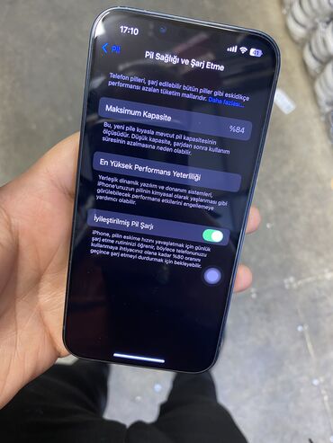 - Batareya: “Pil Sağlığı və Şarj Etmə” bölməsində Maksimum Kapasite 84% görünür; İləşdirmiş Pil Şarjı aktivdir