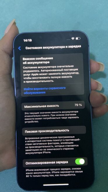 - Batareya: Tənzimləmələrdə göstərilən “Battery Health” məlumatına görə maksimum tutum 79% (ekranda bildiriş mövcuddur)