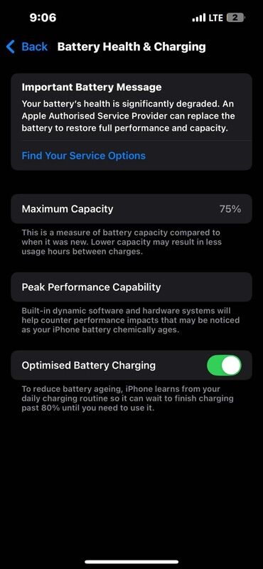 - Batareya bölməsi: Battery Health & Charging səhifəsində “Maximum Capacity: 75%” yazılır; “Optimised Battery Charging” açıqdır