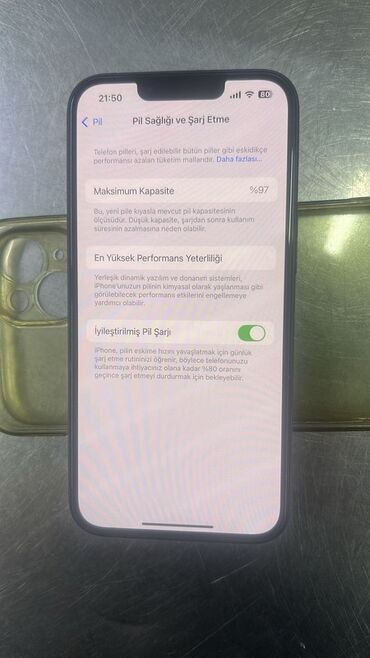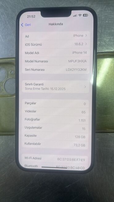 Telefonun bütün məlumatları şəkillərdə təsdiqlənir: “Haqqında” və “Batareya Sağlamlığı” bölmələrinin screenshotları əlavə edilib. Şık midnight rəngli gövdə, ikiqat kamera modulu və yüksək performanslı A15 Bionic ilə gündəlik istifadə, foto/video və oyunlar üçün ideal seçimdir.