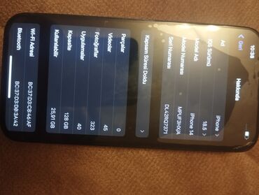 Məhsul: Apple iPhone 14, 128 GB Xüsusiyyətlər: - Model: iPhone 14 (Model nömrəsi: MPV03HX/A) - Yaddaş: 128 GB - iOS versiyası: 18.6.2 - Rəng: Ağ arxa səthli (şəkildə maqnitli dairəvi plaka mövcudd...