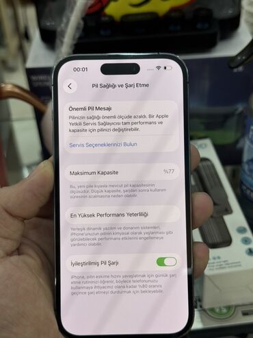 - Bateria: Maksimum tutum 77% (şəkildə “Pil Sağlığı və Şarj Etmə” ekranı)