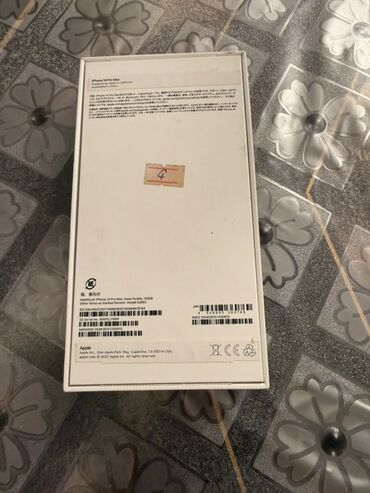 Qutunun arxa etiketində model və yaddaş göstəriciləri: iPhone 14 Pro Max, Deep Purple, 128GB (model A2893).