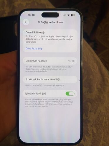 - Batareya bölməsi: Maksimum tutum 100%. Ekranda “Bu iPhone-un orijinal Apple pilinə sahib olduğu doğrulanamır” məlumat bildirişi görünür; batareya sağlamlığı barədə sistem qiymətləndirməsi məhdud ola bilər.