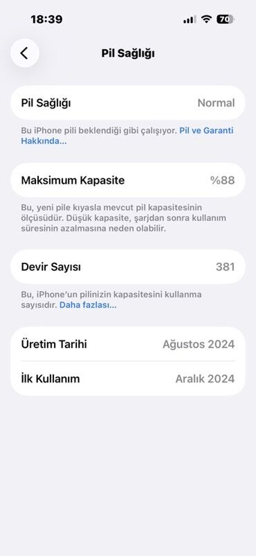 - Batareya sağlamlığı: 88%, dövr sayı 381