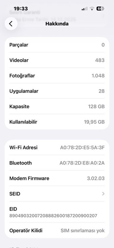 - Mövcud boş yaddaş: 19,95 GB