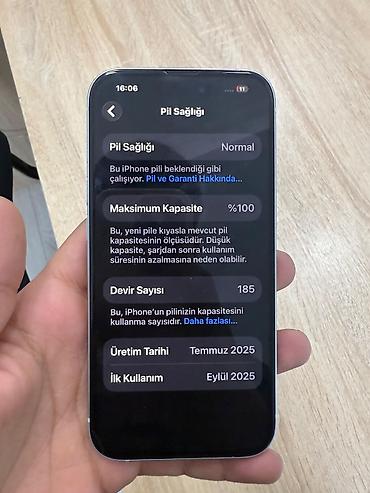 Apple iPhone (ağ rəng) - Model: iPhone 15 (şəkillərdəki dizayn – ikili diaqonal kamera modulu, USB‑C portlu yeni nəsil korpus) - Rəng: Ağ Batareya məlumatı (ekrandan): - Pil sağlamlığı: Normal - Ma...