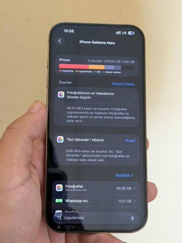 - Yaddaş: 256 GB (şəkillərdə istifadə 209.89 GB göstərilir).