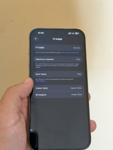 - Batareya: Sağlamlıq bölməsində “Normal”, maksimum tutum 93%, dövr sayı 309; istehsal tarixi 2024‑cü ilin noyabrı, ilk istifadə dekabr 2024.