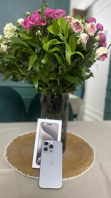 Apple iPhone 15 Pro – Titanum gövdə, gümüşü rəng (Natural Titanium-a oxşar ton). Qutu və aksesuarları şəkillərdə mövcuddur.