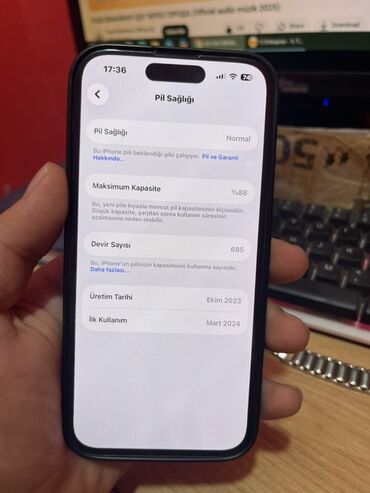 - Batareya bölməsi ekran görüntüsünə əsasən: Maksimum Kapasite 88%, Devir sayı 685; istehsal tarixi Ekim 2023, ilk kullanım Mart 2024