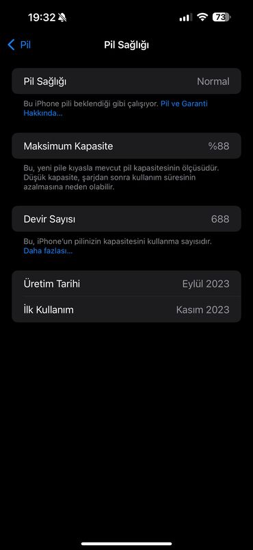- Akkumulyator: “Pil Sağlığı” bölməsinə əsasən maksimum tutum 88%, dövr sayı 688. İstehsal tarixi: Sentyabr 2023. İlk istifadə: Noyabr 2023. Pil statusu “Normal” göstərilir (ekrandakı şəkilə əsasən).
