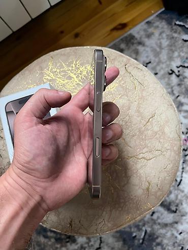 Məhsul: Apple iPhone (Pro seriyası) Rəng: Açıq qızılı/krem ton Korpus: Mat arxa panel, düz kənarlı metal çərçivə Port: USB‑C alt hissədə Düymələr: Sol kənarda səs düymələri və Action/Səssiz ...