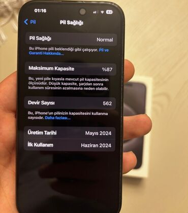 IPHONE 16 pro 128 gb. 99% pil. 230 doldurma dövrlərinin sayı. Karobkası var. Heç bir problemi yoxdur. Əla vəziyyətdə