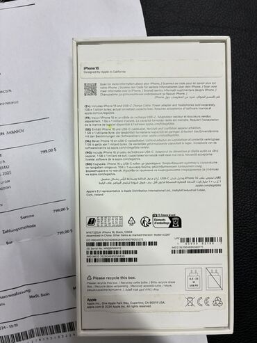 Məhsul: Apple iPhone 16 (A3922), rəng: Black, yaddaş: 128 GB Qutu üzərindəki məlumatlar: - Model: iPhone 16 - Rəng: Black - Yaddaş tutumu: 128 GB - Dizayn: Designed by Apple in California - Qutu tə...