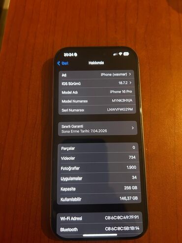 - Model: iPhone 16 Pro (model nömrəsi: MYNK3HX/A)