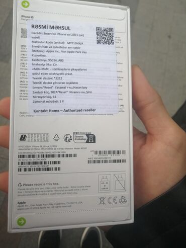 Məhsul: Apple iPhone 16 (A3922), rəng: Black, yaddaş: 128 GB Qutu üzərindəki məlumatlar: - Model: iPhone 16 - Rəng: Black - Yaddaş tutumu: 128 GB - Dizayn: Designed by Apple in California - Qutu tə...
