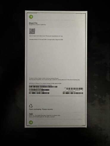 Məhsul: Apple iPhone 17 Pro Max Rəng: Cosmic Orange Yaddaş: 256 GB Model: A3926 Qutunun tərkibi: iPhone 17 Pro Max və USB‑C şarj kabeli Qablaşdırma: Kağız qablaşdırma (recycle işarəli) Önə çıxan x...