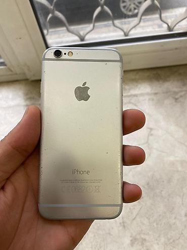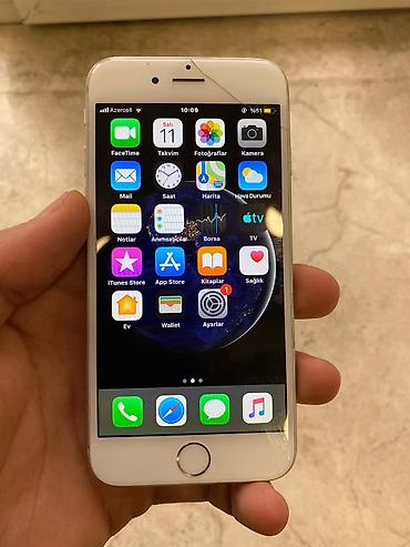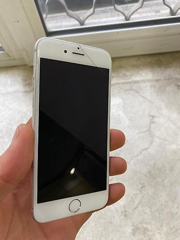 Gümüşü rəngli Apple iPhone 6 smartfonu. Cihazın ekranı çatlaqdır və dəyişdirilməyə ehtiyacı var, lakin işləməyində heç bir problem yoxdur. Barmaq izi skaneri işlək vəziyyətdədir. Hal-hazırda istifa...