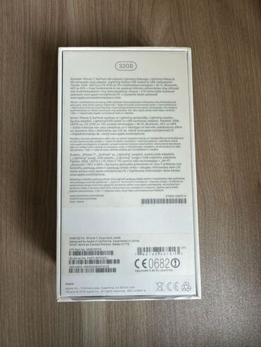 Qutunun üzərindəki rəsmi etiketlər: MN912ET/A, “iPhone 7, Rose Gold, 32GB”. CE və digər sertifikat işarələri mövcuddur.