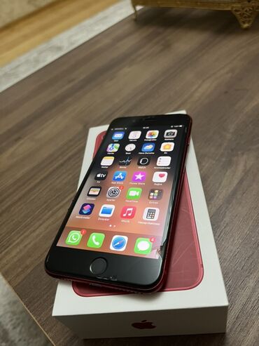 Apple iPhone – RED rəng (Product RED) - Arxa tərəf: qırmızı rəng, Apple loqosu, ikili arxa kamera və LED flaş - Ön tərəf: Touch ID düyməli ekran - Ekranda iOS kilid ekranı görünür - SIM kart yuvası...