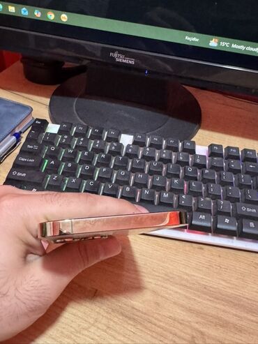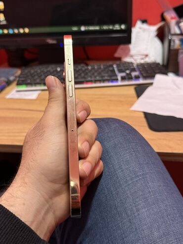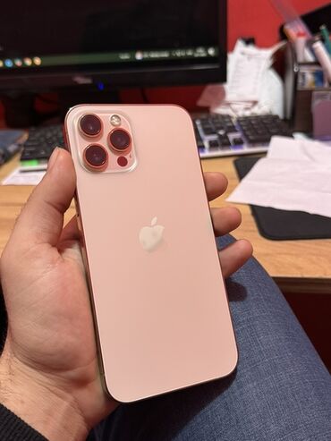Apple iPhone – çəhrayı tonlarda korpus, üçlü arxa kamera modulu və LED flaş. Korpusda düz, parlaq metal çərçivə, yuxarı və aşağı hissədə düzbucaqlı kənarlar. Sol tərəfdə səs artır/azalt düymələri və səs-küy/səssiz keçidi, sağ tərəfdə yan enerji düyməsi. Arxa paneldə Apple loqosu, kameraların ətrafında dekorativ qırmızı halqalar.